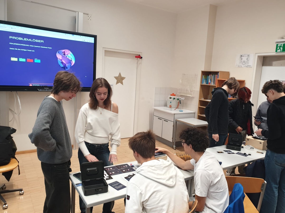 Passend zum World Quantum Year 2025 hatten Schüler:innen zweier Basismodul Physik-Kurse am Mittwoch, den 8.10.2025, die Möglichkeit einige Grundprinzipien der Quantenphysik in einem Escape-Game kennen zu lernen. Durch das Programm führte der Quantenphysiker Jan Kumlin, der an der Technischen Universität Wien im Bereich der Quantenoptik forscht.