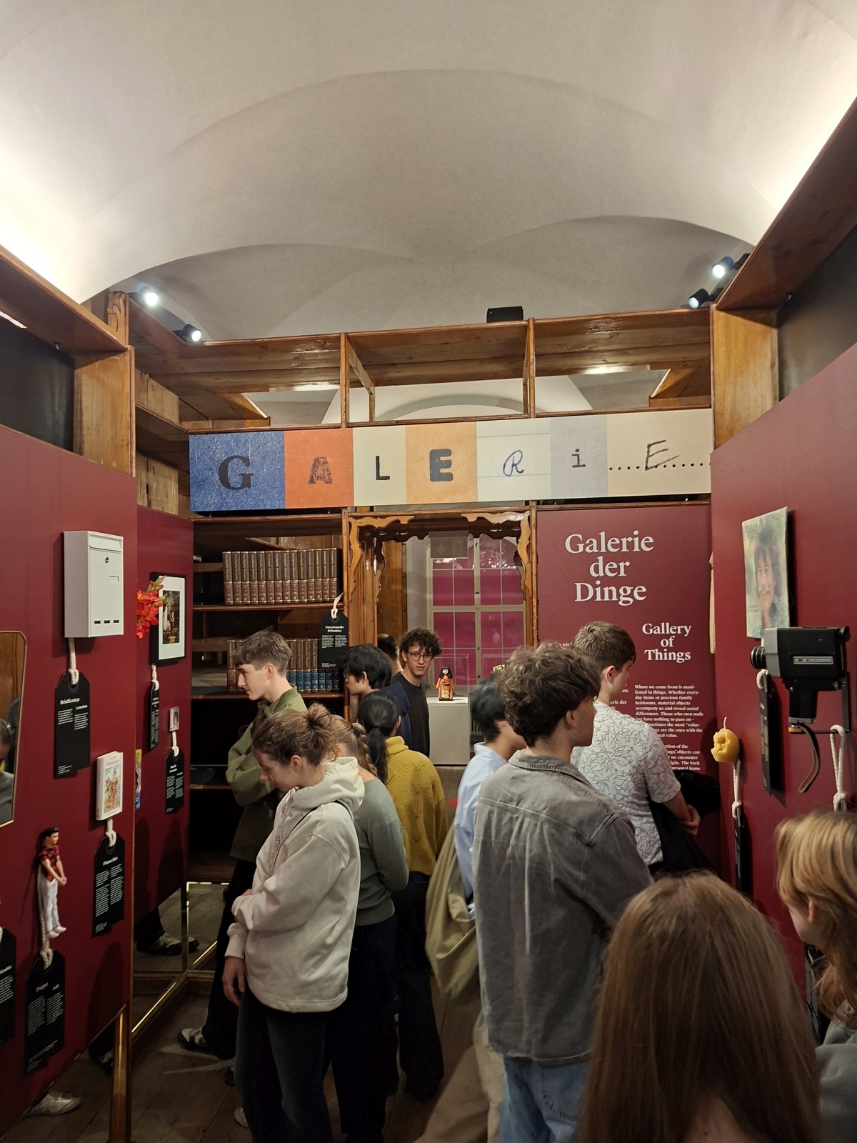 Die Ausstellung beschäftigte sich damit, wie man Herkunft definieren kann, ob geografisch, sprachlich, sozial oder kulturell, und wie dieser Aspekt das Leben und Schreiben vieler Autorinnen und Autoren beeinflusst. Schon beim Eintreten merkten wir, dass uns nicht nur klassische Literatur erwartete, sondern ein sehr persönlicher Blick auf das Leben verschiedener österreichischer Autorinnen und Autoren. Das Thema war sehr vielfältig umgesetzt. Es ging nicht nur um »klassische« Biografien, sondern auch um Flucht, Migration, Mehrsprachigkeit und soziale Herkunft. Es gab Originalmanuskripte, Tagebücher, Briefe, Tonaufnahmen und persönliche Gegenstände bekannter Schriftstellerinnen und Schriftsteller, wie z.B. von Ingeborg Bachmann, Annie Hernaux, Peter Handke oder Christine Nöstlinger zu sehen. Es war sehr eindrucksvoll, wie die Texte und Lebensgeschichten miteinander verknüpft wurden, die Erfahrungen von Entwurzelung, Armut oder Fremdsein sind auch direkt in die literarischen Figuren und Themen eingeflossen.