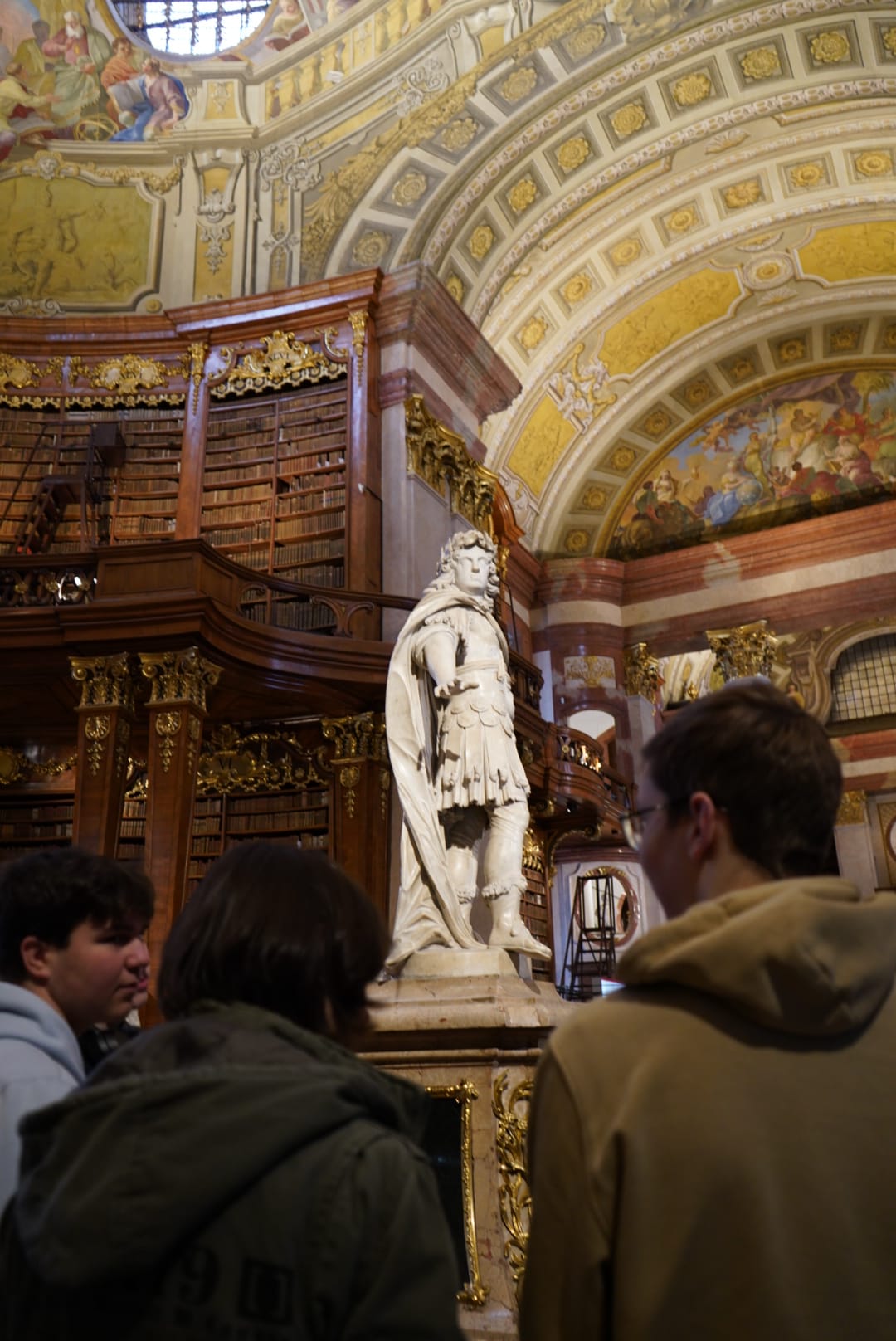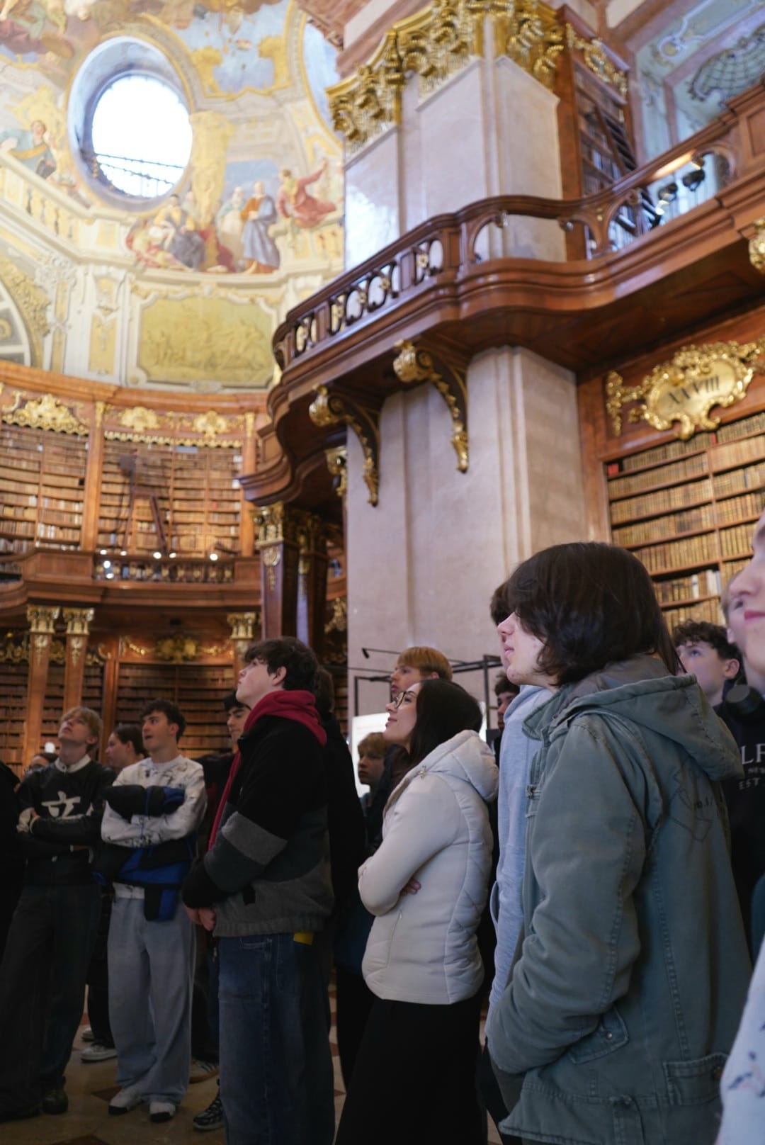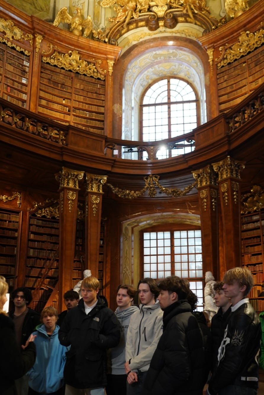 Während der Führung wurden die Schüler:innen über die Erbauung und die Auftraggeber:innen, den Inhalt bzw. die Bücher des Prunksaals sowie über die Merkmale informiert, die man mit der Barockzeit verbinden kann.