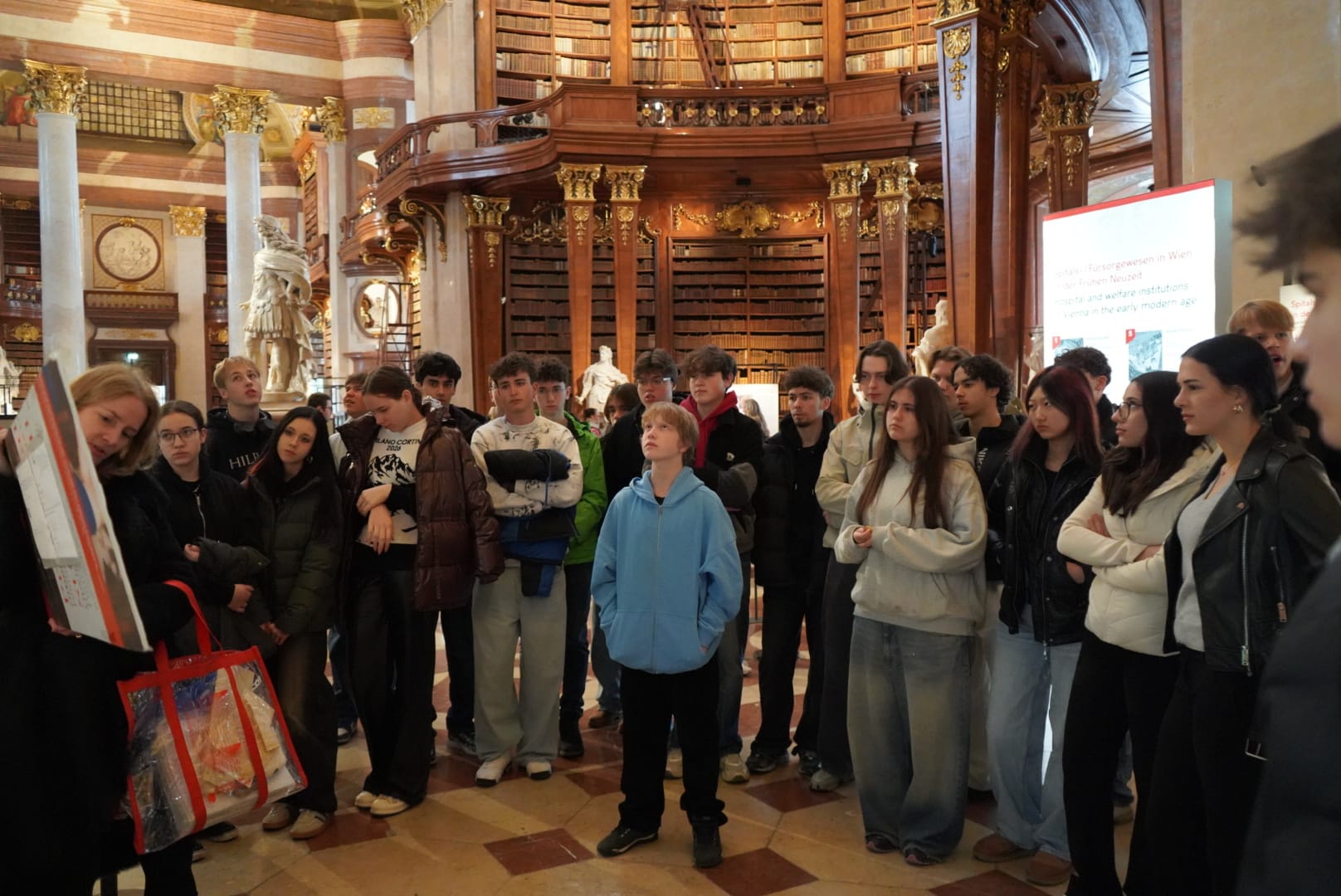 Die 6B unternahm am 11.02.2026 im Rahmen des Deutschunterrichts eine Exkursion in die Nationalbibliothek im 1. Wiener Gemeindebezirk. Passend zur literarischen Epoche des Barocks besuchte die Klasse den Prunksaal der Nationalbibliothek, der ein hervorragendes Beispiel für diesen Stil bietet.