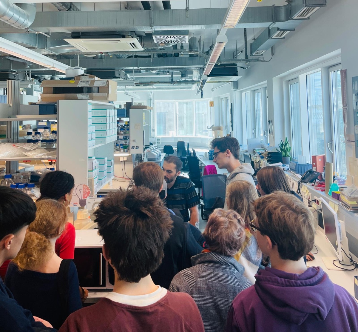 Highlights waren nicht nur topmoderne Laborgeräte und kuriose Kunstobjekte, sondern auch die institutseigene Cafeteria! Die durch gestillten Wissensdurst entstandene gute Laune passte gut zum sonnig-warmen Frühlingswetter, sodass einem angenehmen Spaziergang um den Institutsteich nichts im Wege stand. Besonders beeindruckend ist auch die Zusammenarbeit der jeweiligen Forschungsgebiete, die vor allem dadurch ersichtlich wird, dass einzelne Institutsgebäude, die unterschiedlichen Bereichen der Forschung gewidmet sind, durch Brücken miteinander verbunden werden. Das fördert die Interaktion zwischen unterschiedlich spezialisierten Kolleg:innen und begünstigt das Finden von fachübergreifenden Lösungen.