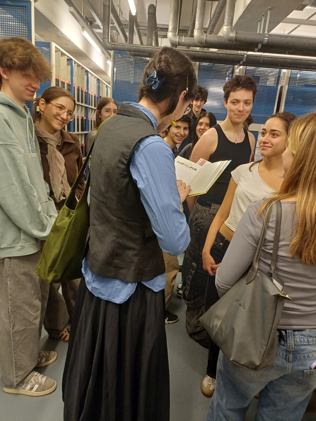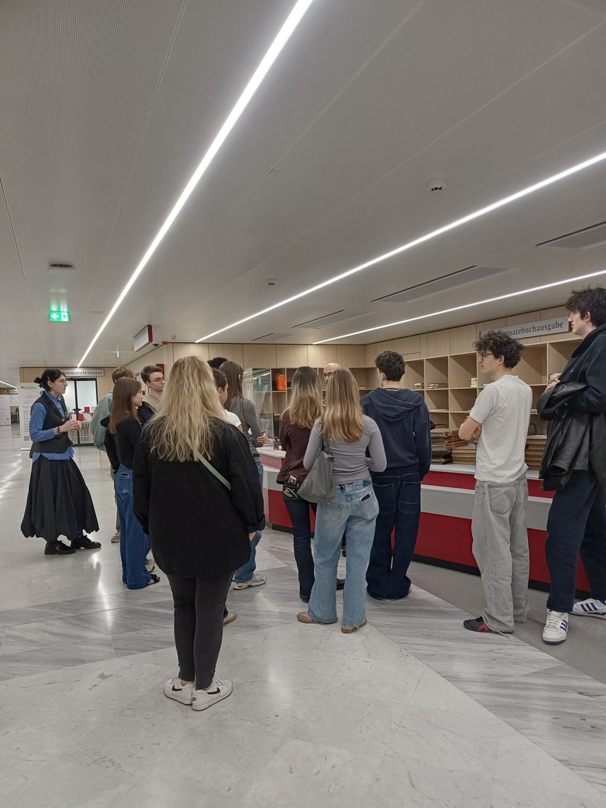 Der erste Programmpunkt führte – begleitet von einem Guide – in die Tiefen des Bücherspeichers am Heldenplatz. Dort erhielten die Schüler:innen einen konzentrierten Einblick in die Welt des archivierten Wissens und konnten bestaunen, wie viele Millionen Druckwerke hier lagern und wie sorgfältig das Wissen vergangener Jahrhunderte bewahrt wird.