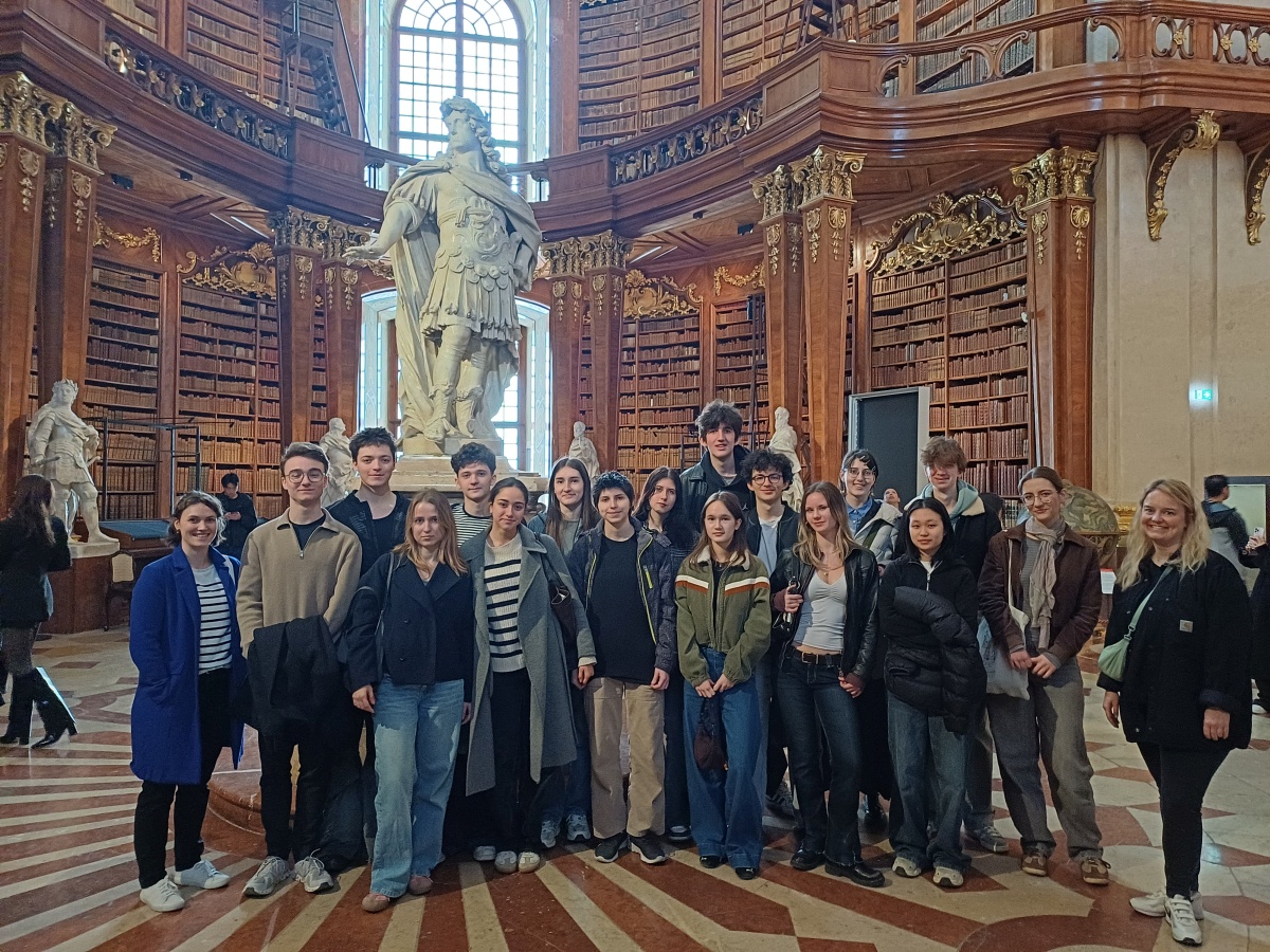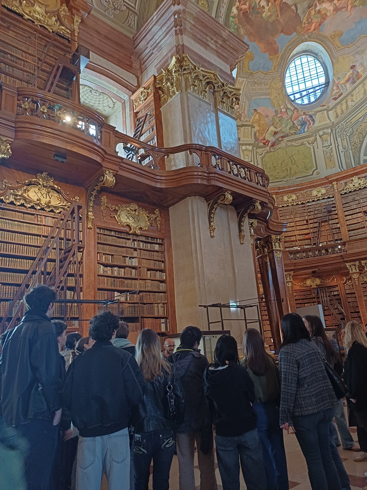 Im Anschluss besuchte die Klasse den Prunksaal, einen der beeindruckendsten Bibliotheksräume Europas. Zwischen barocken Regalen, historischen Globen und kunstvollen Fresken entstand ein lebendiger Eindruck davon, wie eng Geschichte, Architektur und Literatur miteinander verwoben sind.
