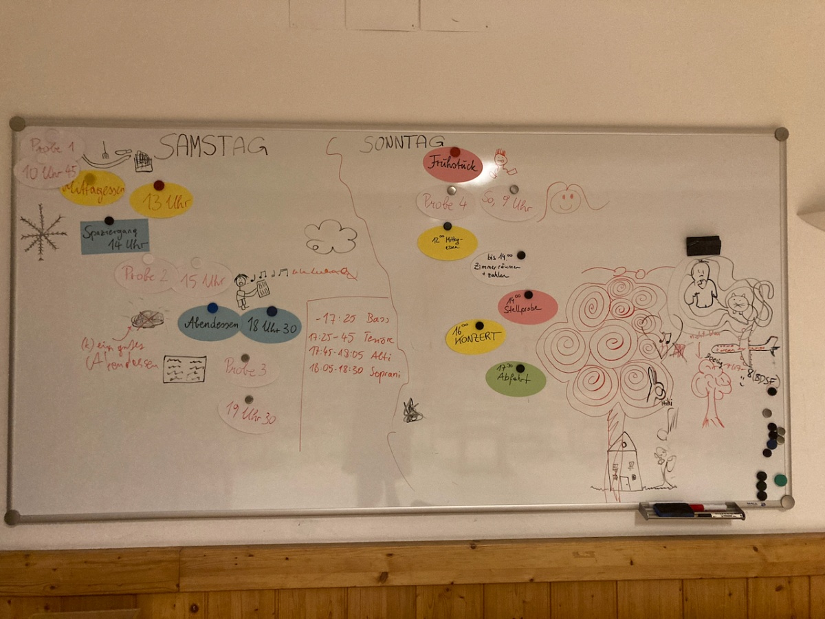 Am nächsten Tag war die Freude auf das Konzert besonders groß, vor allem weil ein weiterer Teil der Choralle dazustieß. Mit fast dem gesamten Chor probten wir noch einmal intensiv bis zum Mittagessen und machten uns anschließend für unseren Auftritt bereit. Das Konzert verlief reibungslos und war ein voller Erfolg. So beendeten wir unser Chorwochenende zufrieden und stolz – mit vielen schönen Erinnerungen, guter Stimmung und noch mehr Motivation für die nächsten Proben.